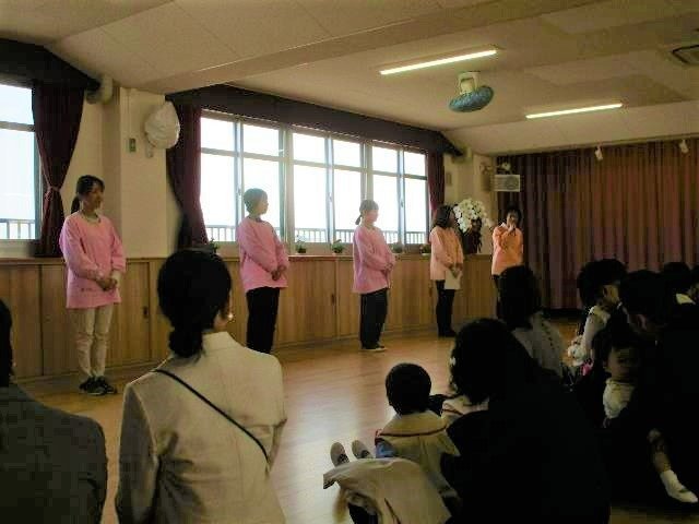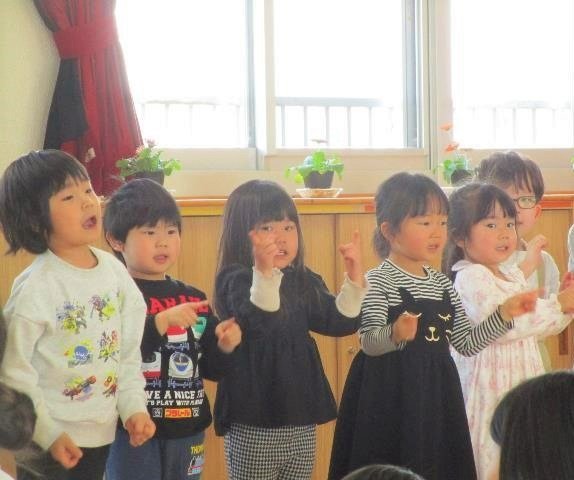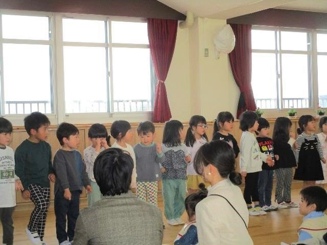 幼児組の入園式では、年長と年中のお兄さん、お姉さんから「きみたち今日から友達だ」の歌のプレゼントがありました!新しい友達のために元気よく、そして優しい声で歌ってくれた年長さんと年中さん。「ちゅうりっぷ」の歌を振り付きで一緒に歌ったり、「トントントントンアンパンマン」手遊びではみんなで元気よく「あーんパンチ!」と言ったりしながら、楽しいひとときを過ごすことができました。
