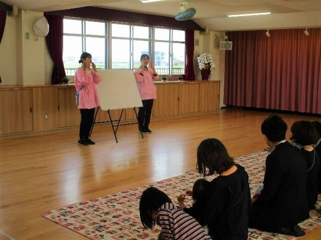 低年齢児組の入園式では、親子で一緒に手遊びをした後、ゆったりとした雰囲気の中で「だるまさんと」の大型絵本やパネルシアターを見たりしました。