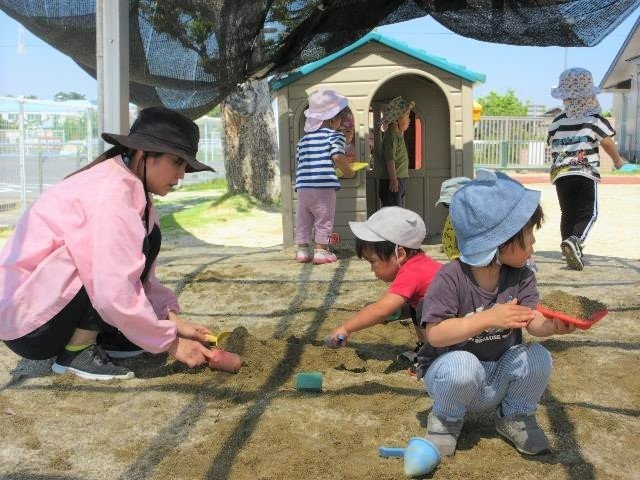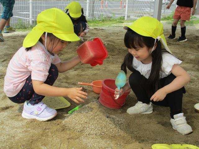 戸外遊びをすると汗ばむ季節になりました。子どもたちは水分補給をしながら元気に遊んでいます。幼児組は、リレーやかけっこ、体操などで体を動かして遊んだり、砂場で友達とごちそうづくりを楽しんだりしています。他にも虫探しや草花摘みが大好きな子どもたち!西部保育園にはシロツメクサやクローバー、タンポポなどたくさんの草花があるので、草花に集まったテントウムシやダンゴムシなどを子どもたちは夢中になって探しています。低年齢児組は、砂遊びが大好き!スコップで砂をすくったり、砂遊び用のお皿やコップに入れたりするのを繰り返し楽しんでいます。これからも風の心地よさや太陽の光を感じながら、保育者や友達と戸外遊びを楽しんでいこうと思います。