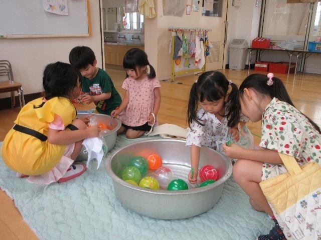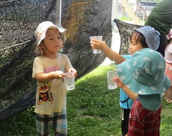 低年齢児は、水が大好き!2歳児は、綺麗で涼しげな色水に興味をもち、ポンプを押して自分の好きな色水を出してジュースづくりを楽しみました。また、テントの上から落ちてくる水を「雨みたい!」と大喜びしながら、カップに水を集めようと一生懸命な子どもたちでした。1歳児もシャワーから出てくる水をコップで集めよう頑張っています! 夢中になって水を集めることで水の心地よさや不思議さを感じている子どもたちです♪