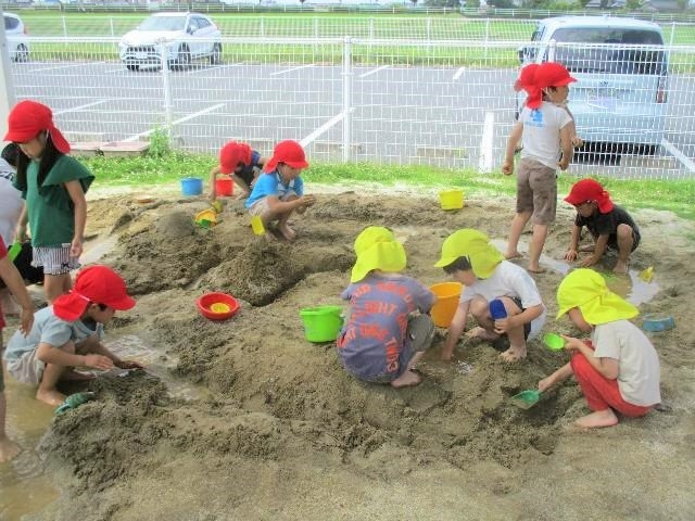 園庭やデッキでは、子どもたちがワクワク♪ドキドキ!しながら、泥や水に触れています。幼児は裸足で園庭に出ることで足の裏からも砂や泥の感触を楽しみ、砂場では山や水路を友達と協力してつくったり、砂や泥をいろいろなものに見立ててごちそうづくりをしたりしています。また、水鉄砲や保育者がかけてくれる水のシャワーでダイナミックに水の心地よさを感じている子もいます。シャボン玉コーナーでは、大きなシャボン玉をつくろうとシャボン液の膜を優しく、ゆっくり吹くなど自分になりに考え、試しながら楽しんでいる子どもたちです!