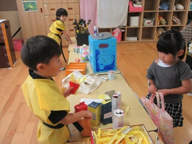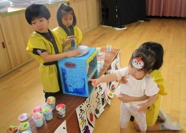 7月17日、18日に夏まつり会を行いました。17日は幼児組の夏まつり会でした。食べ物屋さんや水風船屋さん、わなげ&魚釣りにジュース屋さん!どのお店も、“楽しそう!行ってみたい!”と思えるお店ばかりで、子どもたちは「次どこ行く?」「あのお店行ってみようよ!」とワクワクしながら異年齢のペアの子と一緒にお店めぐりをしていました。また、年長児はそれぞれのお店の人になりきって、お客さんに優しく声をかけたり、「いらっしゃいませ!」や「〇〇屋さんに来てくださーい!」と呼び込みをしたりする姿が見られました。