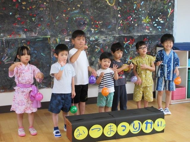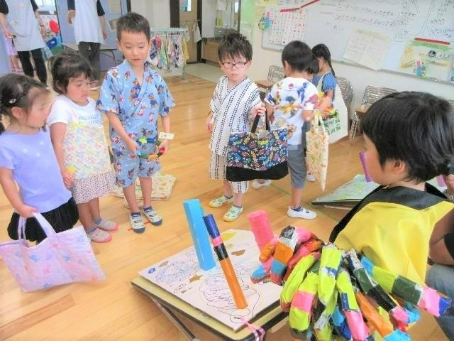 年長児みんなで考え、準備してきた夏まつり会☆ お店や飾りなど一つ一つに子どもたちのアイデアが詰まっていて、みんなで楽しめた夏まつり会になりました♬