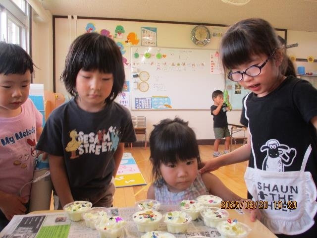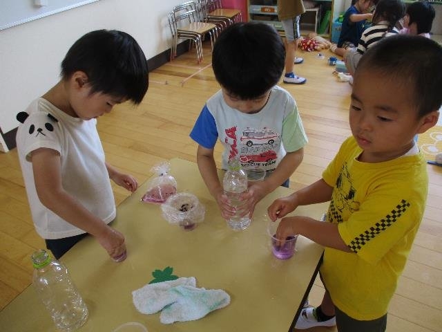 8月後半も毎日暑い日が続いています。園庭に出て遊ぶことができないため、遊戯室や保育室で体を動かしたり、水遊びやごっこ遊びをしたりして楽しんでいます。年長児は憧れの“鳴子”を使って保育者や友達と一緒にいろいろな振りを試しながら踊ることを楽しんでいます。ポーズやみんなで言う掛け声が決まると満足そうな子どもたちの表情が見られます。年中児の石けんケーキづくりでは一生懸命泡立てた石けんがクリーム状になる不思議さを感じたり、デコレーションする楽しさを感じたりする子どもたちです。年少児はアサガオの色水づくり。水の中でアサガオを揉み出すと透明な水がアサガオと同じ色に…!色の変化の不思議さに驚いたり涼しげで綺麗な色水に大喜びしたりしていました!