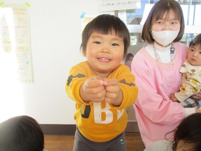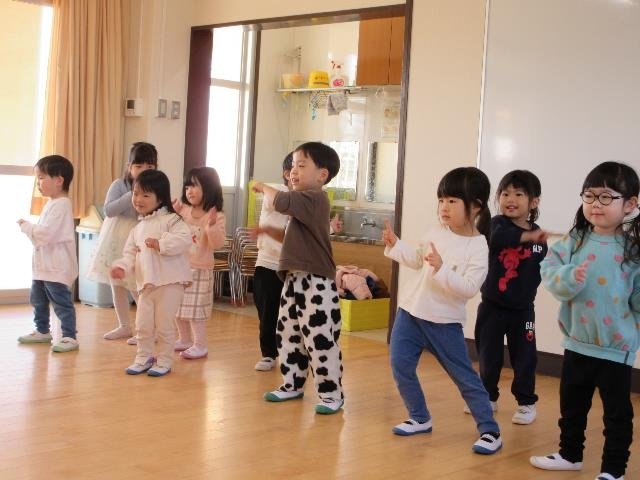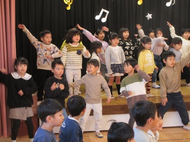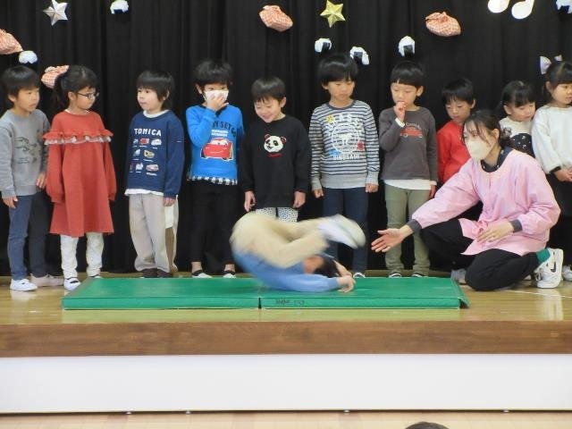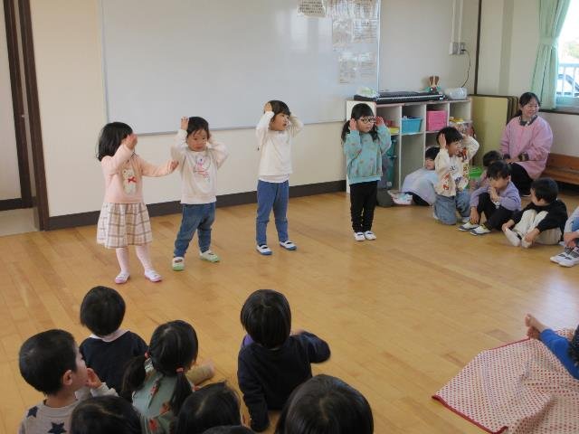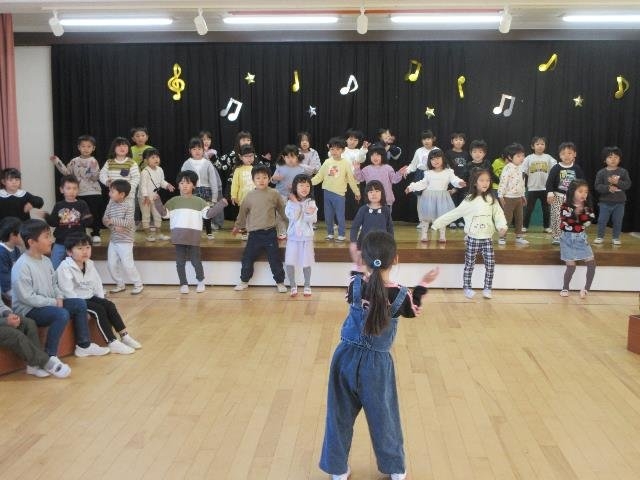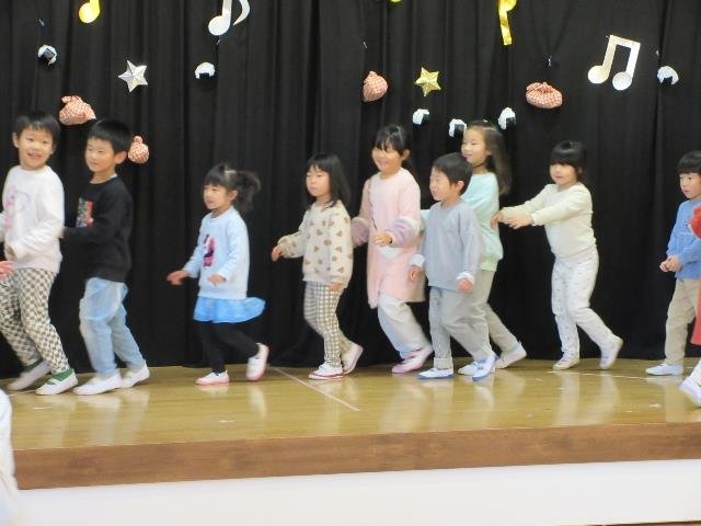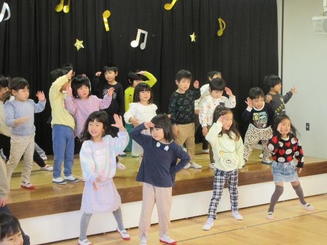 年少組さんは、低年齢児組さんに遊戯を披露しました♪ 友達と顔を見合わせながらとっても楽しそうに踊る年少組さん!その姿を見て、低年齢児組さんも振りを真似して身体を動かしたり、お兄さん、お姉さんの踊りを嬉しそうに見たりしていました。「よかったらお部屋で踊ってみてね!」と声をかけてくれた、優しい年少組さんでした。