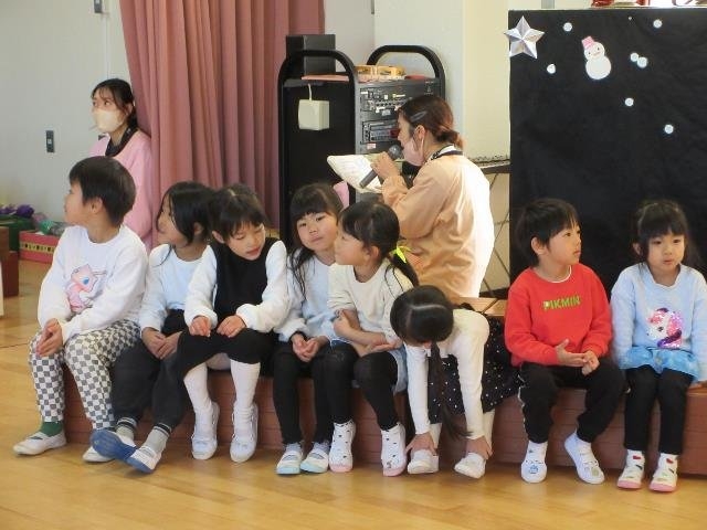 ☆保育園の遊戯室で人形劇団の方を招いて人形劇鑑賞を楽しみます