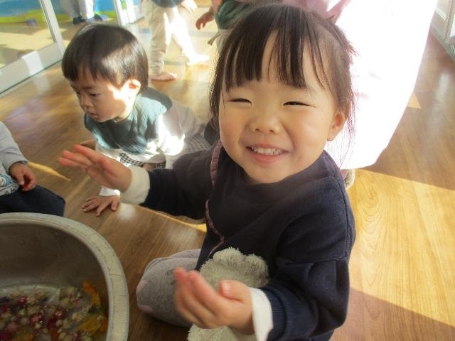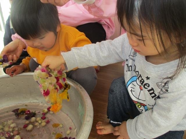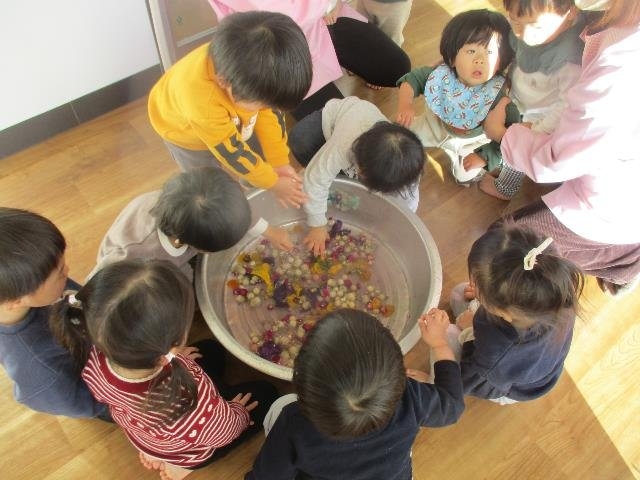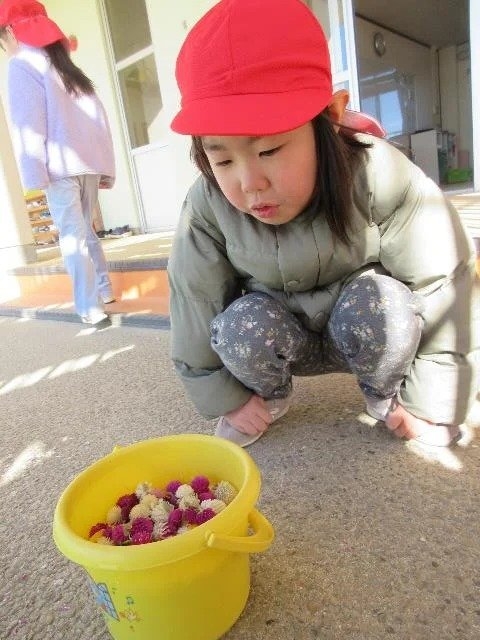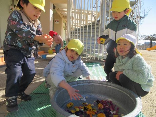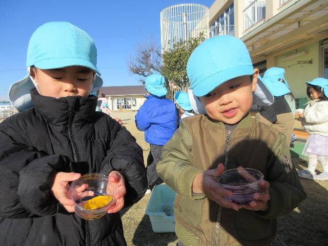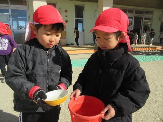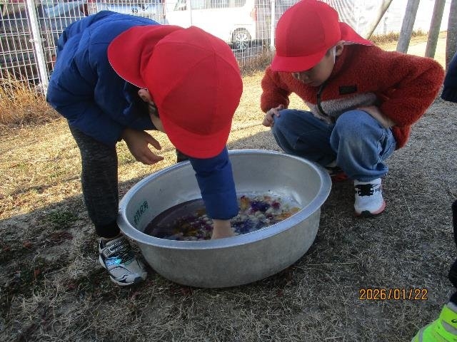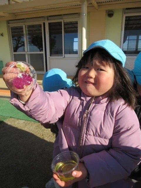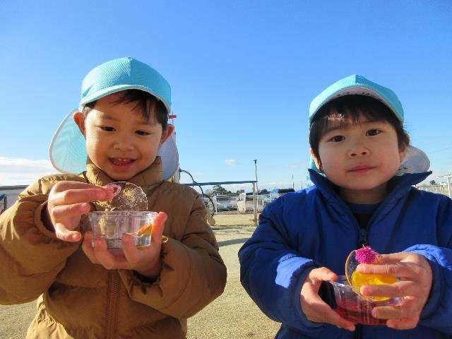 1月後半から寒さが厳しくなり、気温も低くなりました。この気候にぴったりな遊びといえば“氷づくり!” 幼児組の子どもたちは、カップや砂遊びのバケツ、たらいなどいろいろな容器を用意し、友達と水の量や容器を置いておく場所を相談しながら氷づくりに期待をもつ姿が見られました。氷づくりを進めていく中で、パンジーを摘んだ花びらや千日紅のドライフラワーがあったので入れてみることに…。水に浮かぶ花びらを見て、「わぁー!きれい!」「氷になるの楽しみ!」と子どもたちに大好評!!