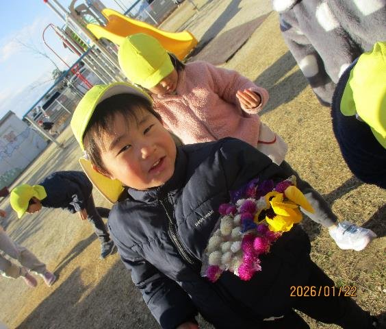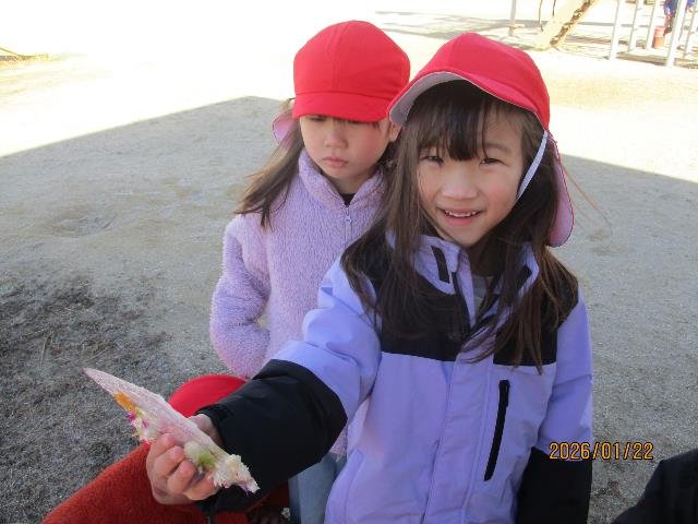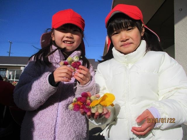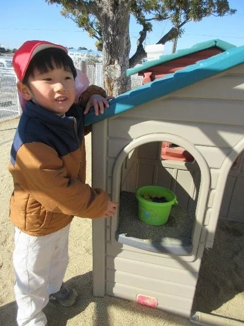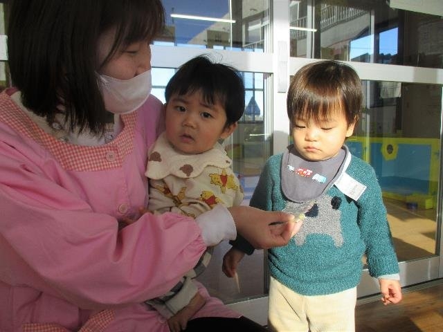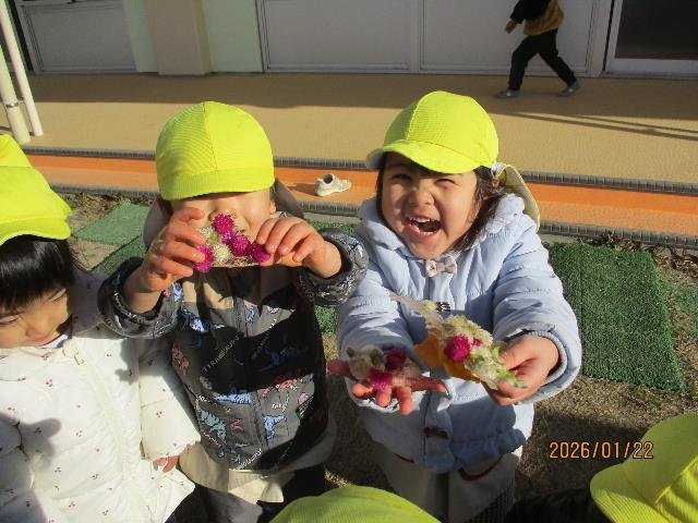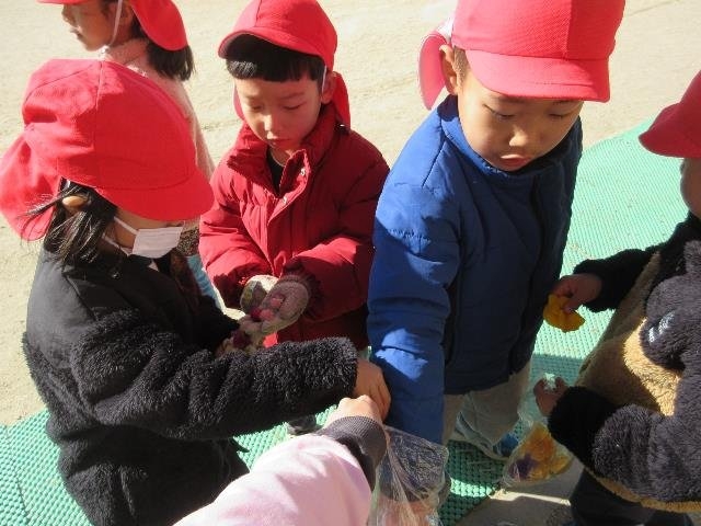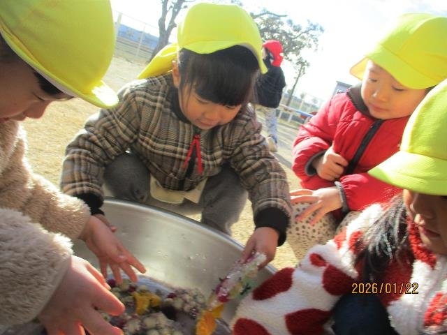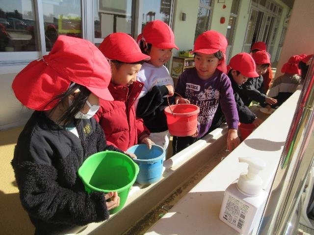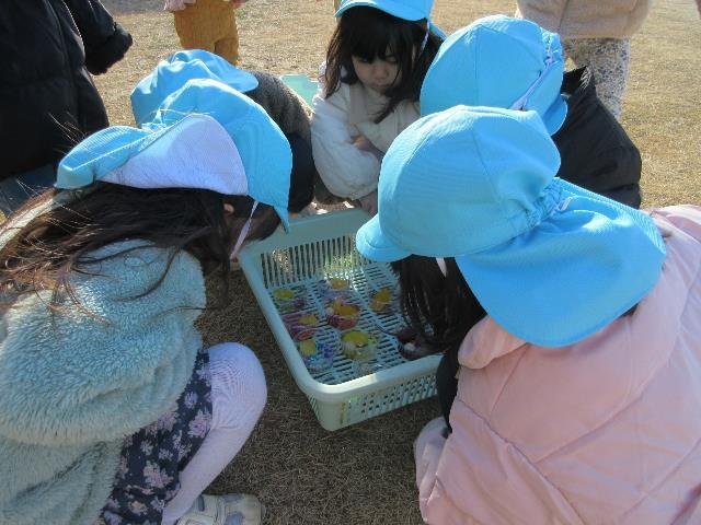 1月後半から寒さが厳しくなり、気温も低くなりました。この気候にぴったりな遊びといえば“氷づくり!” 幼児組の子どもたちは、カップや砂遊びのバケツ、たらいなどいろいろな容器を用意し、友達と水の量や容器を置いておく場所を相談しながら氷づくりに期待をもつ姿が見られました。氷づくりを進めていく中で、パンジーを摘んだ花びらや千日紅のドライフラワーがあったので入れてみることに…。水に浮かぶ花びらを見て、「わぁー!きれい!」「氷になるの楽しみ!」と子どもたちに大好評!!