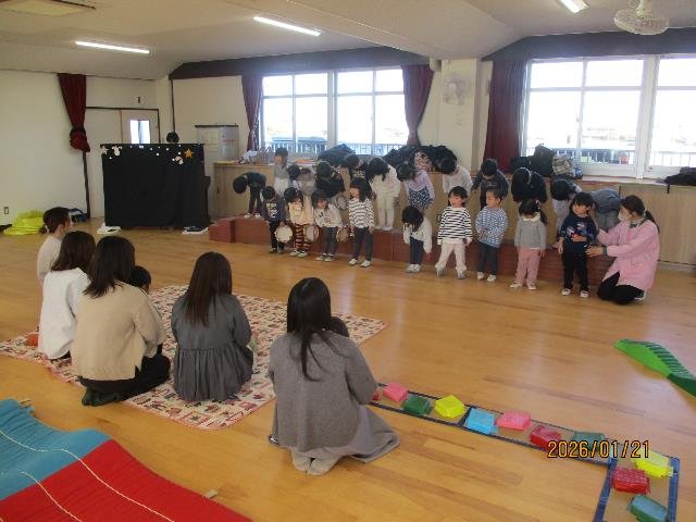 保育園の遊戯室で、飛び石歩きや、トンネル、トランポリンなどで体を動かして遊びました!年少組の子たちが合奏を披露してくれました。