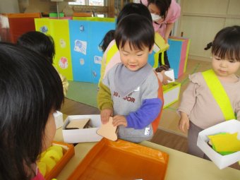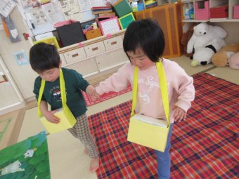 低年齢児さんは、保育園で遠足ごっこをしました。保育室の、公園コーナーやお弁当遊びのコーナーで遊びました。