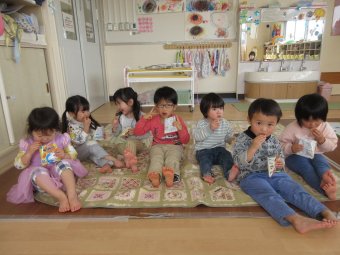 10時のおやつはレジャーシートのようにマットを広げて食べると、ピクニック気分で「たのしいね」と会話も弾みます。