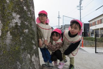 かくれんぼをしてみたら、隠れるところが少なくてみんなで木の後ろでぎゅっと肩を寄せ合って隠れていました。「みつからないように…しずかにね」