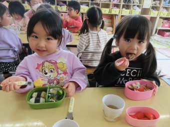朝から楽しみにしていたお弁当です!「おにぎりだいすき!」「いちごだー!」とひとつひとつのおかずを嬉しそうに味わっていました。