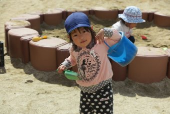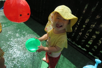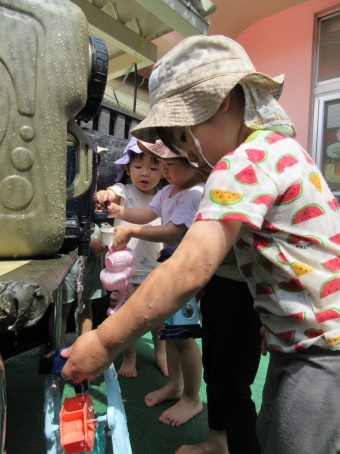 低年齢児さんは、バケツやカップに水をいっぱい溜める遊びが大好きです。カップから溢れた水がかかると「キャー」と声を上げて喜んでいます♪