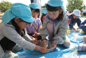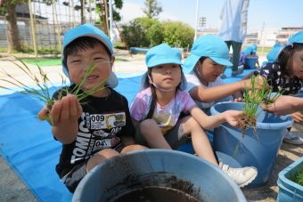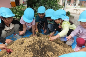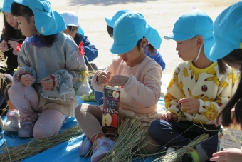 バケツ稲は、JAの方に教えていただきながら年長児が脱穀と籾すり体験をしました。「たいへんだね」「めっちゃ、ちからがいるー!!」いつも食べている米は、食べるまでに多くの工程があることを知りました。収穫したお米は、調理体験でおいしくいただく予定です。楽しみだね!
