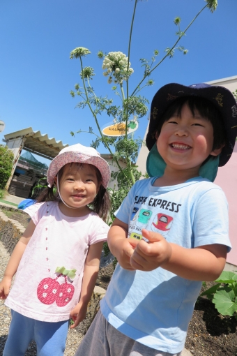 子どもたちの背丈よりも大きく伸びた人参に花が咲きました。「初めて見た」という声がたくさん聞かれた珍しい花を間近で見られる貴重な経験となりました。