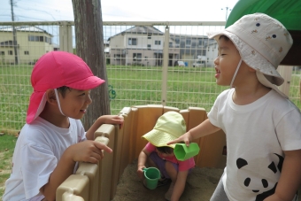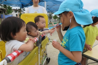 戸外では幼児さんも低年齢児さんも、涼しい砂場や木陰で遊んでいます。「いっしょにやろうね」「あかちゃんが、わらってくれた!」と優しい気持ちで関わってくれる幼児さんと、一緒に遊べて嬉しそうな低年齢児さんです。