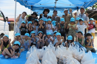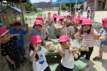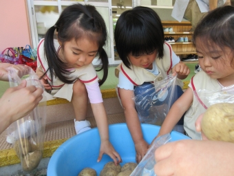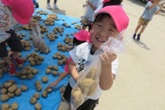 新田地域資源保全隊の皆さんからじゃがいもをたくさんいただきました。じゃがいも畑でじゃがいも掘りをさせていただく予定でしたが、気温が高かったため保育園までじゃがいもを運んできてくださいました。たくさんのじゃがいもを前に大喜びの子どもたちは、好きなじゃがいもを選んで持ち帰りました。
