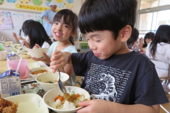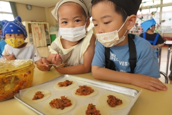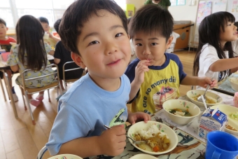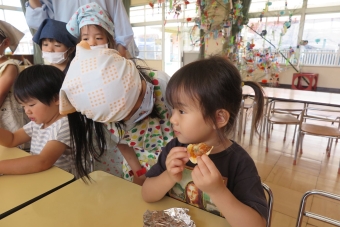 ナスやピーマン、玉ねぎなど収穫した野菜でカレーやピザをつくって食べました。年中児はピザをつくってみんなを招待してくれました。「おいしい」と言ってもらえて、得意気な顔です。