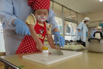 今回は、年長さんが野菜を切ってくれましたよ。ドキドキしながらも丁寧に切ったり、火加減をチェックしてくれたりしました。