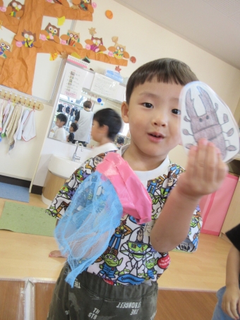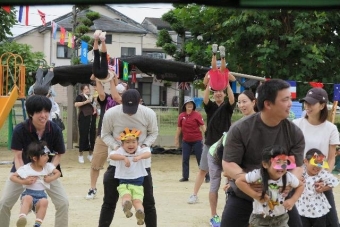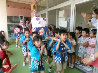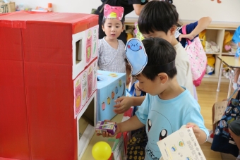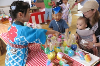 新田保育園の夏祭りは今年も大賑わいでした 。年長児が話し合って、虫のおみこしやおばけのおみこし、食べ物屋さんにたこ焼きのボール投げなどのアイデアが出ました。そのアイデアをもとに幼児組のみんなが協力していろいろな物を製作してくれました。地域の未就園児のお友達も一緒に、夏祭りの雰囲気を味わいましたよ。ジュースの自動販売機にボールを入れたら、本物のジュースが出てきてびっくり!