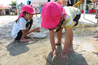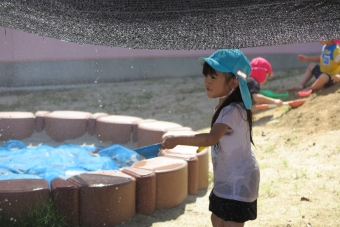 毎日暑い日が続いています。暑さ指数の計測や水分補給をこまめにしたり、木陰やミストの活用をしたりして戸外遊びができる日には、水遊びや泥んこ遊びをしています。