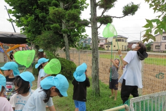 セミやバッタなどの虫に触れたり見たりする中で、虫に興味をもつ子が増えました。園庭だけでなく、保育室でも虫探し遊びをしています。うさぎ組の子は、小さな虫取り網と虫かごを持って虫探しごっこに夢中になっています。