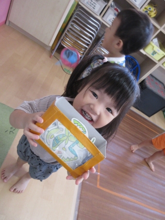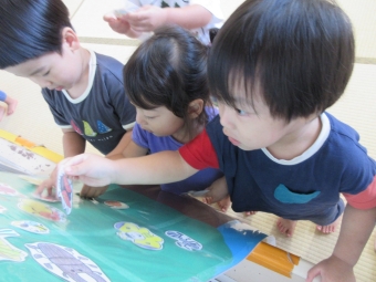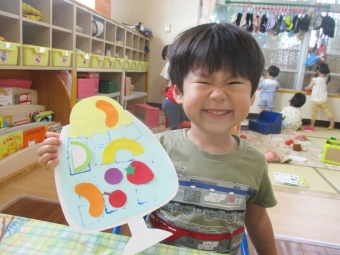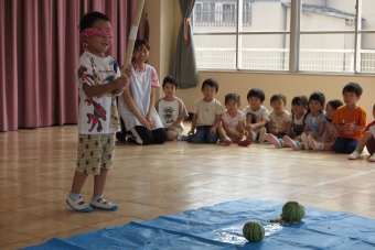 暑い日には、室内でも夏の遊びをしています。年長児は自分たちで育てたスイカでスイカ割りをしました。それを見ていた年少さんも「やってみたい」と、スイカ割りごっこをしました。うさぎ組の製作は、夏にぴったり!「ひんやりフルーツサイダー」です。