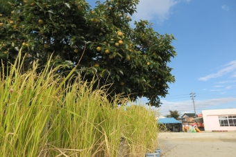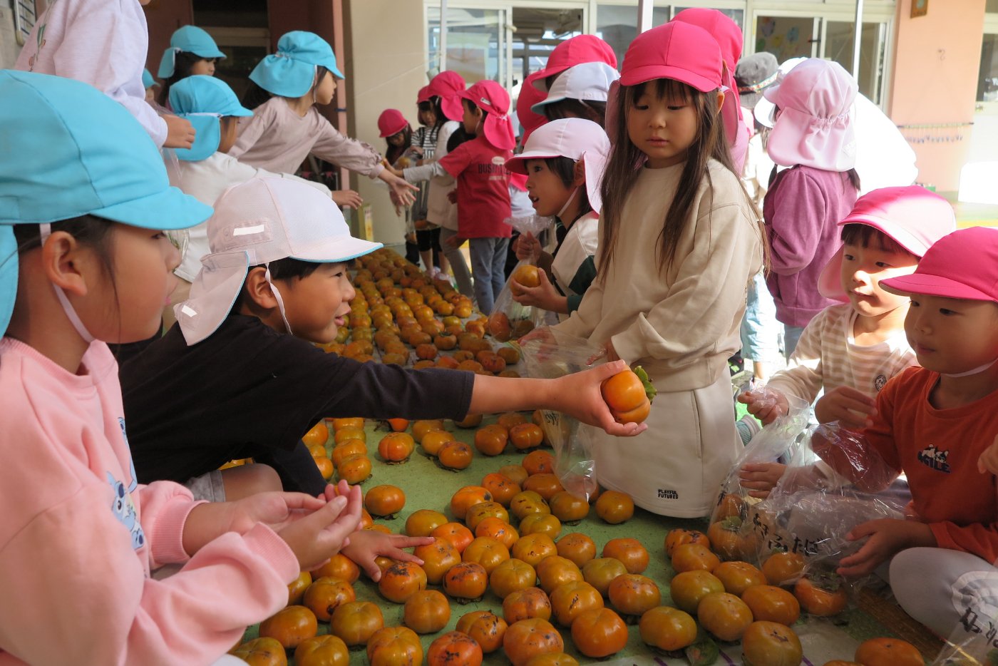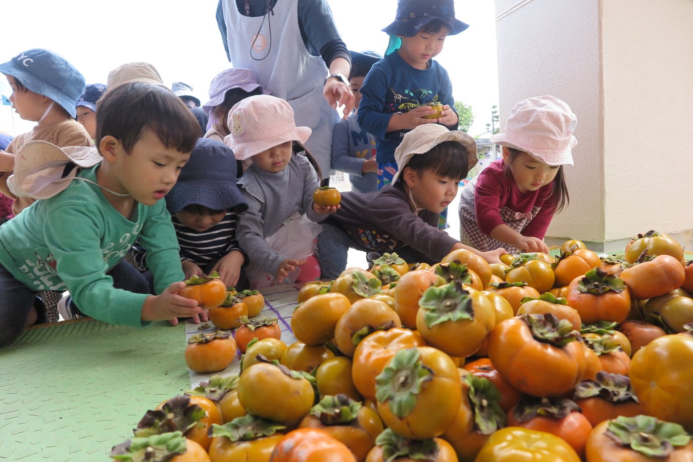園庭では、カキの実がオレンジ色に色付き始め、バケツ稲の稲穂が風に吹かれてシャラシャラと音を立てながら揺れています。10月の終わりには、年長児が稲刈りと脱穀体験をします。収穫の秋をみんなで楽しみにしています。