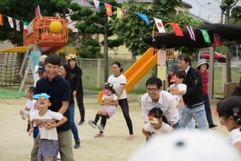 親子競技では、動物のイメージに合わせてふれあい遊びをしました。とても楽しみにしていた子どもたちは、お父さんやお母さんにぶら下がったり抱っこしてもらったりと、笑顔いっぱいの時間を過ごすことができました!