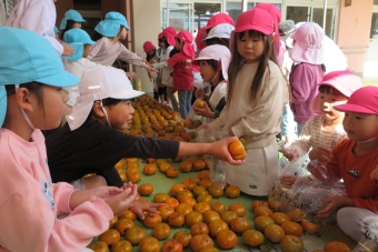 今年もバケツ稲や柿、サツマイモなど、たくさんの収穫ができました。園庭で実った柿は、約1000個!新田保育園で毎年恒例になっている、柿屋さんごっこを楽しみました。収穫した柿を磨くと、鮮やかなオレンジ色が見えてきてツヤツヤになります。「みて!ピカピカ!おいしそうでしょ?」と、柿を磨くことを楽しみながら手伝ってくれました。