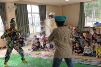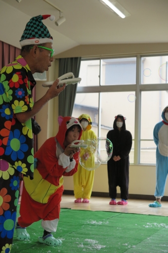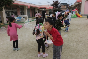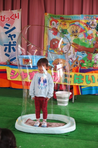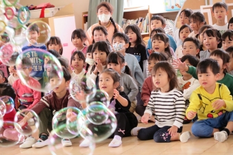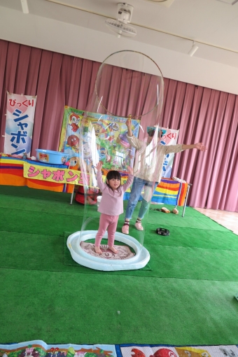 最後は、自分たちでシャボン玉づくりにチャレンジしたよ!シャボン玉の中に小さなシャボン玉をつくったり、大きなシャボン玉づくりをしたりと、さっき見せてもらった技に挑戦しようとする子もいましたよ!