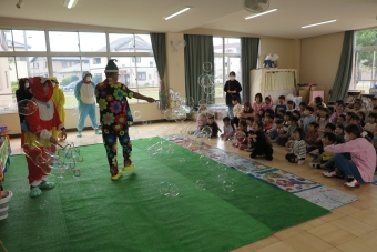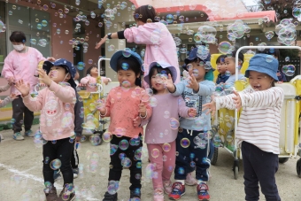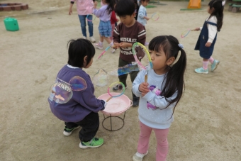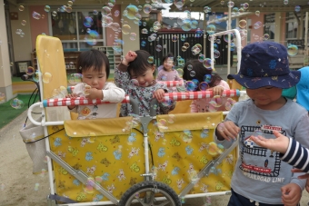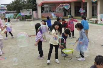 保護者会主催のお楽しみ会で、いろいろなシャボン玉遊びを楽しみました。身近な網やチェーン、うちわなどを使ってシャボン玉をつくる様子を見たり、大きなシャボン玉やたくさんのシャボン玉、ながーいシャボン玉などができると「わぁ!」を歓声をあげたりしながらシャボン玉の世界に引き込まれていました♡